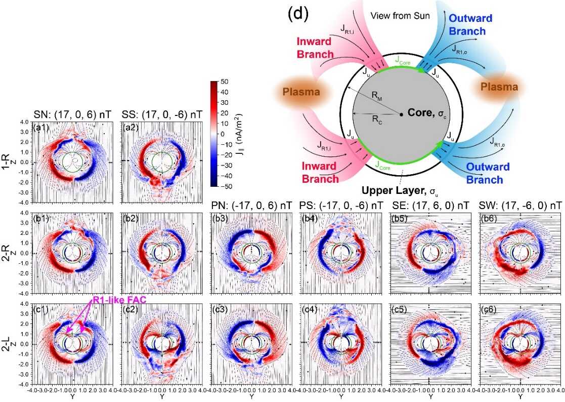 那水星場(chǎng)向電流是不是真的能通過星球內(nèi)部導(dǎo)電物質(zhì)閉合?若能,那水星內(nèi)部物質(zhì)導(dǎo)電率的高低如何影響場(chǎng)向電流的建立?建立起來的場(chǎng)向電流分布形態(tài)會(huì)不會(huì)也顯著受控于外部太陽(yáng)風(fēng)磁場(chǎng)的方向?具體如何受控,與地球的一樣嗎?