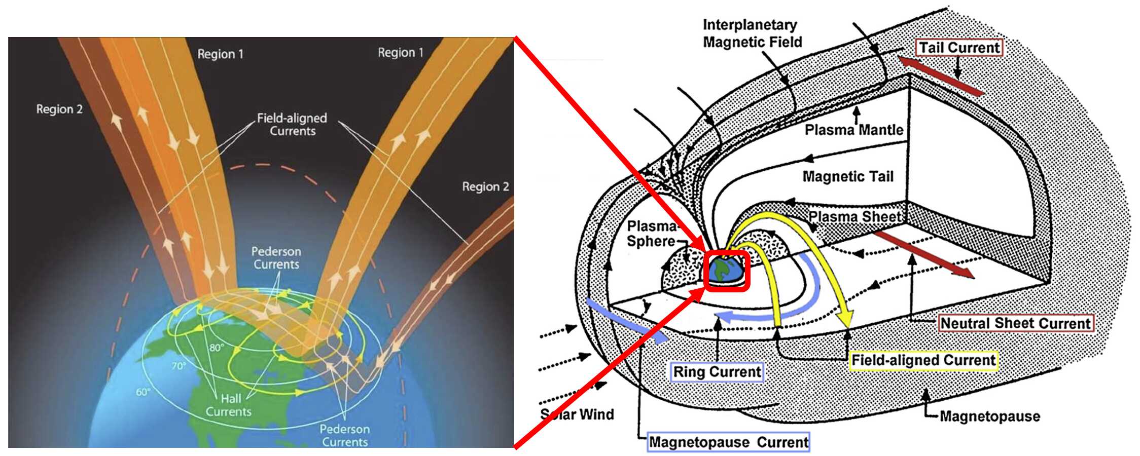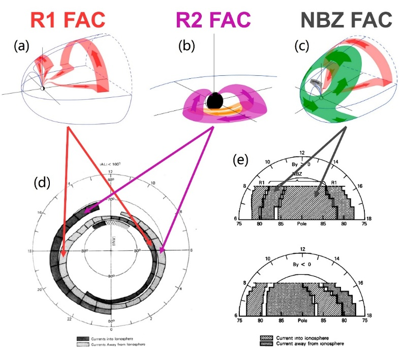 地球的大尺度場(chǎng)向電流依據(jù)其分布形態(tài)大體可以分為三類:1區(qū)場(chǎng)向電流,2區(qū)場(chǎng)向電流,以及NBZ場(chǎng)向電流(圖2)。地球場(chǎng)向電流通過電離層完成閉合。1區(qū)場(chǎng)向電流從晨側(cè)流入電離層,從昏側(cè)流出電離層;2區(qū)場(chǎng)向電流則分布在1區(qū)場(chǎng)向電流的赤道側(cè),它從昏側(cè)流入電離層,從晨側(cè)流出。NBZ場(chǎng)向電流在正午附近1區(qū)場(chǎng)向電流的極向側(cè),從午后流入電離層,從午前流出電離層。大量研究表明,地球場(chǎng)向電流的分布會(huì)顯著受太陽(yáng)風(fēng)磁場(chǎng)方向的調(diào)制。