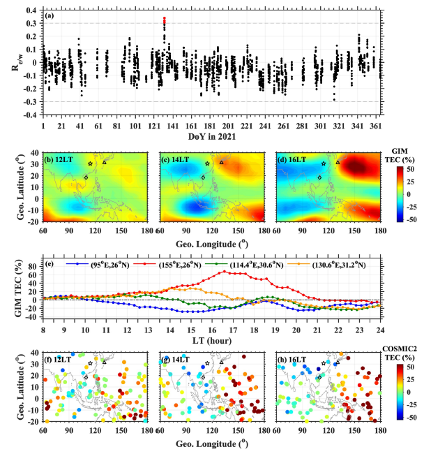 圖1 (a) 2021年Kp < 2且地方時(shí)13:00–17:00時(shí)段內(nèi)的東西差異指數(shù)Re/w變化,紅色圓點(diǎn)表示Re/w絕對(duì)值大于0.3的情況;(b, f) 2021年5月11日12:00 LT、(c, g) 14:00 LT和(d, h) 16:00 LT時(shí)刻,基于GIM和COSMIC-2數(shù)據(jù)在60°–180°E經(jīng)度與20°S–40°N緯度范圍內(nèi)的相對(duì)總電子含量(TEC)空間分布;(e)?四個(gè)觀測(cè)站點(diǎn)的相對(duì)GIM TEC隨地方時(shí)的變化曲線(xiàn)