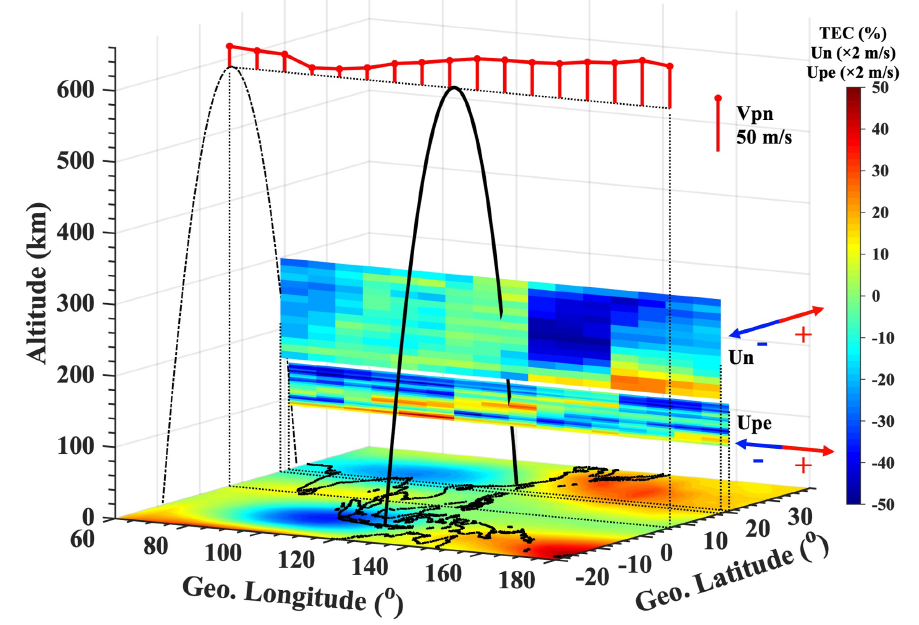 圖2?地理坐標(biāo)系空間分布圖:底部平面顯示圖2b中14:00 LT時(shí)刻的相對(duì)總電子含量;120°E經(jīng)線(xiàn)穿越南北半球的磁力線(xiàn)用黑色實(shí)線(xiàn)標(biāo)示,其投影用黑色點(diǎn)劃線(xiàn)表示;紅色線(xiàn)條表示ICON衛(wèi)星離子速度計(jì)(IVM)觀測(cè)的Vpn分量;偽彩色圖像顯示ICON衛(wèi)星MIGHTI儀器觀測(cè)的150-300 km高度Un分量(中性風(fēng))和90-150 km高度Upe分量(垂直風(fēng))
