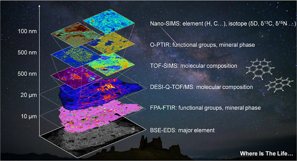 當(dāng)前針對(duì)龍宮等小行星樣品的有機(jī)質(zhì)研究主要采用兩種技術(shù)路徑:其一基于紅外光譜、拉曼光譜等實(shí)現(xiàn)官能團(tuán)的原位表征;其二通過質(zhì)譜技術(shù)檢測(cè)羧酸、氨基酸等可溶有機(jī)分子。然而,傳統(tǒng)分析方法存在顯著局限:光譜技術(shù)難以獲取分子級(jí)結(jié)構(gòu)信息,而常規(guī)質(zhì)譜測(cè)試依賴溶劑提取過程,既破壞有機(jī)質(zhì)原始賦存狀態(tài),又增加地球污染風(fēng)險(xiǎn)。值得注意的是,全面揭示地外有機(jī)質(zhì)的形成演化規(guī)律需要整合賦存狀態(tài)(與礦物基質(zhì)的空間關(guān)系)、元素組成、分子結(jié)構(gòu)及同位素特征等多維信息。面對(duì)樣品量稀缺(毫克級(jí))、有機(jī)質(zhì)含量低(ppm級(jí))且賦存形態(tài)復(fù)雜的挑戰(zhàn),現(xiàn)有單一分析技術(shù)已顯現(xiàn)局限性,亟需發(fā)展多模態(tài)聯(lián)用策略以避免“管窺蠡測(cè)”式分析。