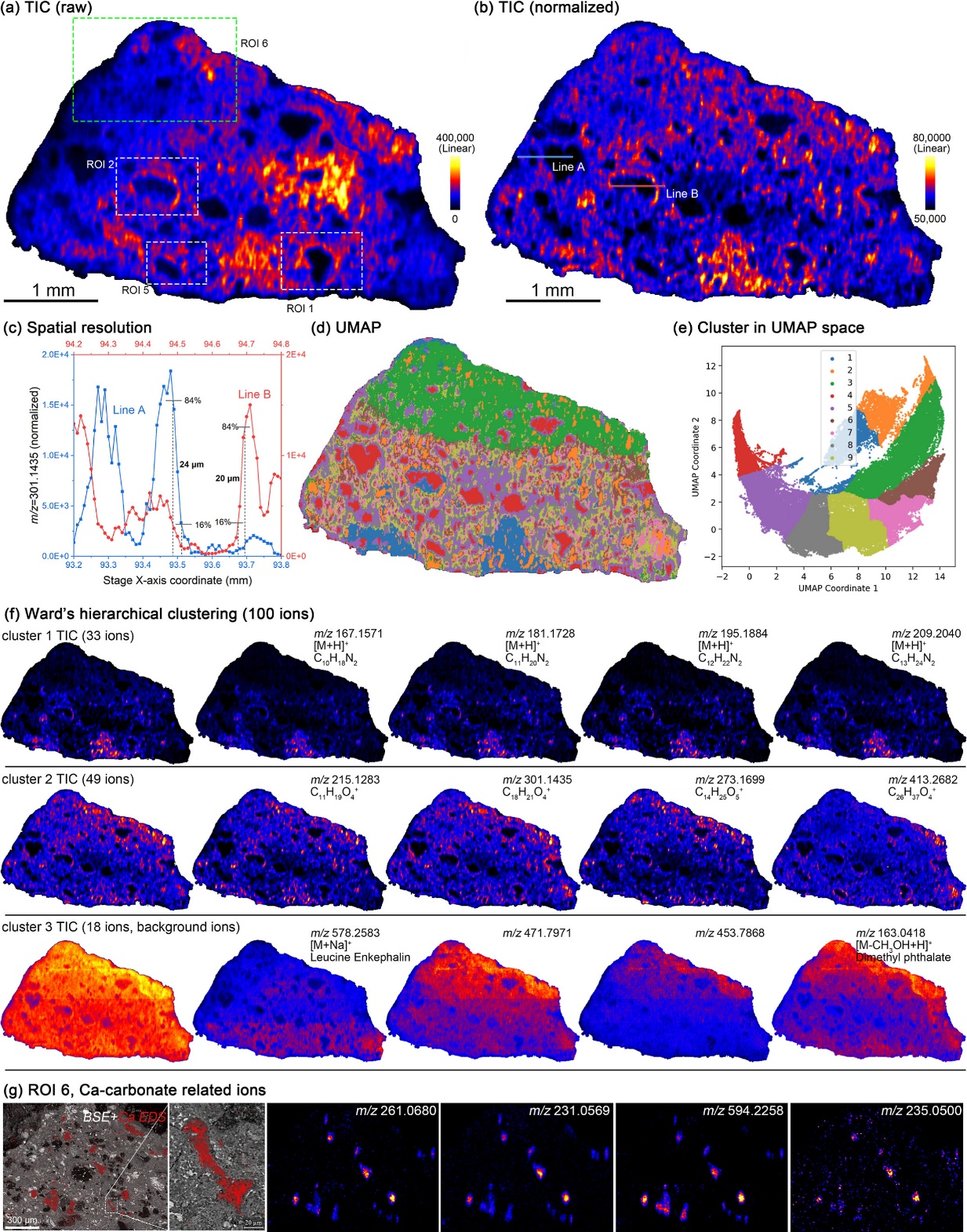 圖2 Murchison隕石的解吸電噴霧電離質(zhì)譜成像(DESI-MSI)。(a)總離子強(qiáng)度圖;(b)歸一化總離子強(qiáng)度圖;(c)?空間分辨率測(cè)量;(d - f) UMAP空間分割結(jié)果與層次聚類結(jié)果;(g)?碳酸鈣礦物(紅色)與其有機(jī)分子分布