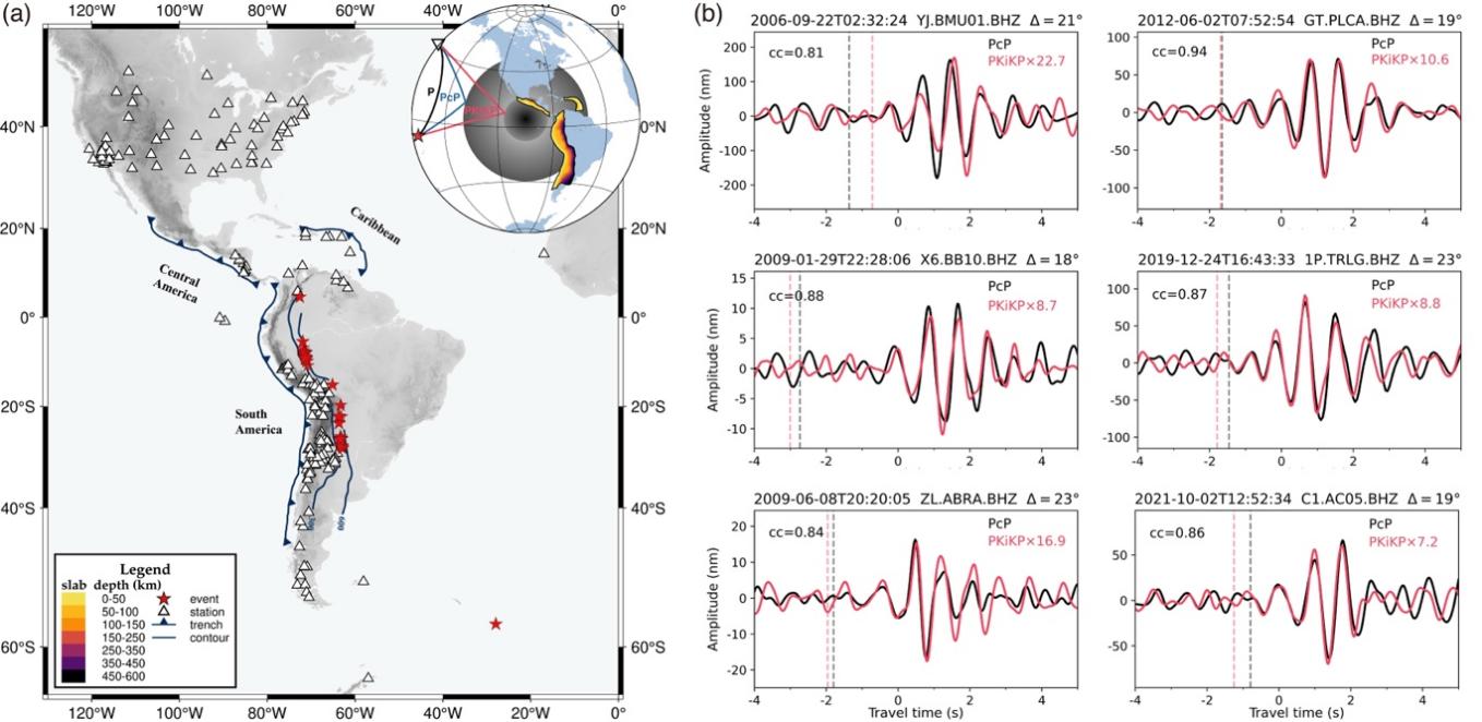 中國科學(xué)院地質(zhì)與地球物理研究所行星科學(xué)與前沿技術(shù)重點實驗室地球-行星內(nèi)部結(jié)構(gòu)與過程學(xué)科組博士研究生崔天宇、導(dǎo)師艾印雙研究員和澳洲國立大學(xué)Hrvoje Tkalcic教授,與其他合作者一起,針對南美洲地區(qū)下方的內(nèi)核邊界結(jié)構(gòu)進行了詳細(xì)的綜合分析。該研究收集了來自IRIS Data Management Center記錄到的122個深源地震(震源深度≥300 km)產(chǎn)生的約33,000條垂直分量記錄,并利用開發(fā)的波形互相關(guān)方法進行震相分類及到時拾取,最終篩選出261條高質(zhì)量、清晰包含地核反射震相(PcP與PKiKP)的地震記錄,組成研究數(shù)據(jù)集(圖1)。研究團隊結(jié)合PKiKP/PcP振幅比、走時殘差、波形相似性以及頻譜分析方法,成功獲得了南美洲下方內(nèi)核邊界物理性質(zhì)及精細(xì)地形起伏結(jié)構(gòu)的新認(rèn)識,為深入理解內(nèi)外核相互作用及內(nèi)核生長的動力學(xué)演化過程提供了新的視角。