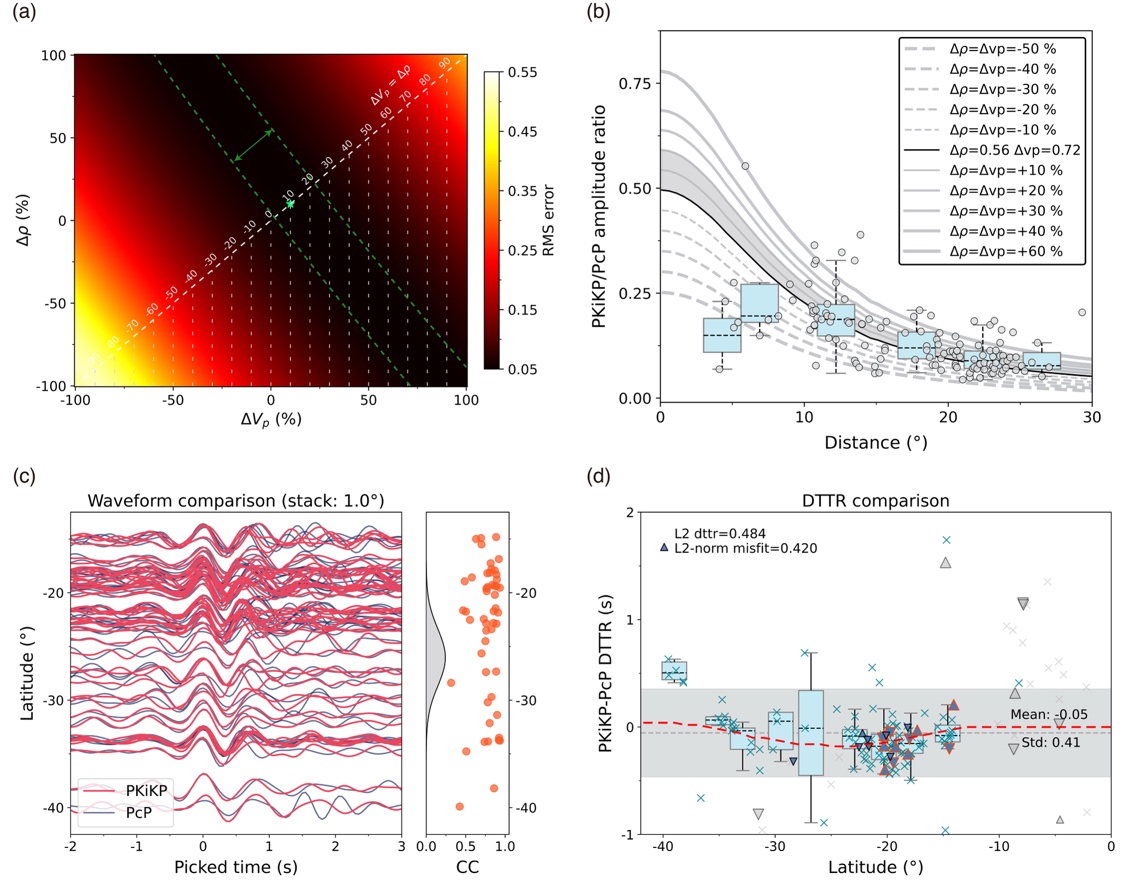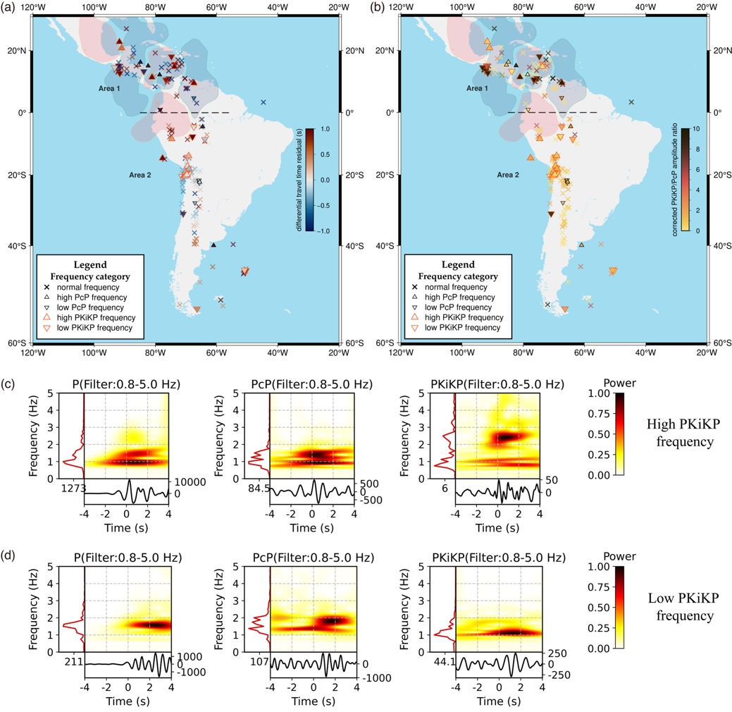 矯正后的走時殘差與振幅比結(jié)果顯示,中美洲及加勒比地區(qū)的結(jié)構(gòu)特征較為復(fù)雜且不確定性較大,這可能與多尺度下地幔不均勻性有關(guān),其影響難以完全排除,因此難以有效解析該區(qū)域CMB與ICB的結(jié)構(gòu)變化。相比之下,南美洲的結(jié)果呈現(xiàn)出更穩(wěn)定的分布模式。頻譜特征顯示,在南緯0°–20°范圍內(nèi)可觀察到明顯的PKiKP高頻或低頻異常,而在約南緯25°附近則以三個震相頻率成分相似為主(圖2)。因此,研究團隊將重點轉(zhuǎn)向?qū)δ厦乐薜挠^測結(jié)果進行分析。