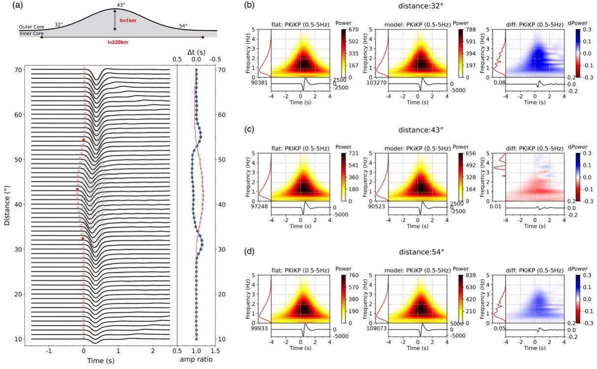 圖4?內(nèi)核邊界隆升地形正演波形及時頻譜對比圖。(a)內(nèi)核邊界隆升地形模型示意圖及與平坦地形波形對比圖;(b)模型左邊界(32°)處的時頻譜比較:平坦模型(左)、隆升模型(中)以及頻譜差(右);(c)和(d)與(b)類似,但分別對應(yīng)模型中心(43°)和右邊界(54°)