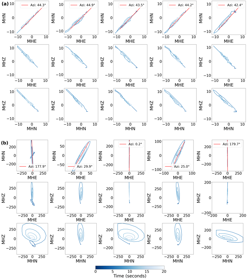 圖3?校準(zhǔn)信號(hào)與12號(hào)站橢圓偏振的加速度型異常信號(hào)的質(zhì)點(diǎn)運(yùn)動(dòng)軌跡對(duì)比。(a)校準(zhǔn)信號(hào)的質(zhì)點(diǎn)運(yùn)動(dòng)情況;(b)12號(hào)站橢圓偏振的加速度型異常信號(hào)的質(zhì)點(diǎn)運(yùn)動(dòng)情況(1972.08.04日落附近)?!癆zi”表示方位角