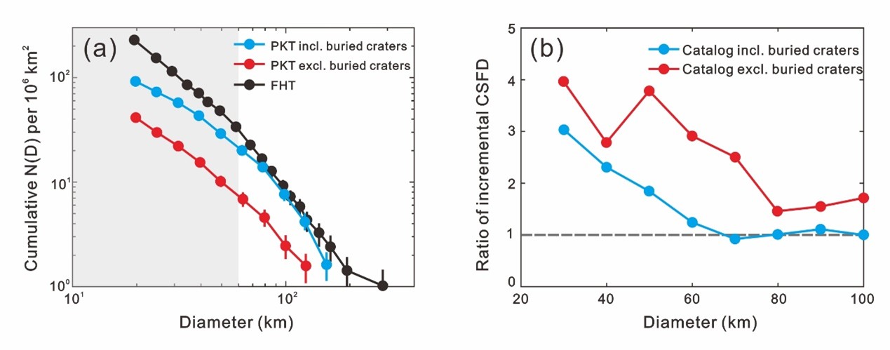 圖2 風暴洋區(qū)域(Procellarum KREEP Terrane, PKT)撞擊坑尺寸-頻率分布統(tǒng)計結(jié)果(左),高地區(qū)域(Feldspathic Highlands Terrane, FHT)和月海區(qū)域撞擊坑尺寸-頻率分布增量比率(右)。圖中藍色和紅色曲線分別代表包含和不包含隱伏撞擊坑數(shù)據(jù)目錄的統(tǒng)計結(jié)果