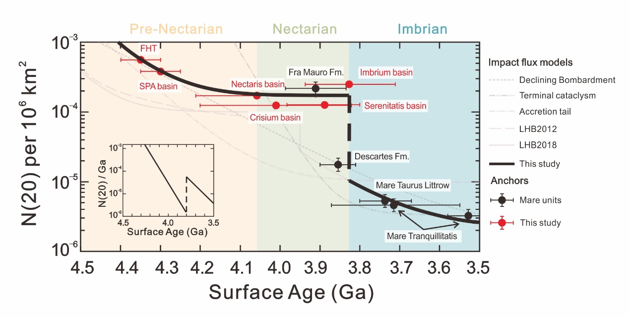 圖3 月球早期撞擊通量模型,紅點為本研究統(tǒng)計的古老大型撞擊盆地的N(20)值,黑點為前人統(tǒng)計的年輕的月海玄武巖單元的N(20)值。圖中同時給出了已發(fā)表的撞擊通量模型,插圖為撞擊通量變化率