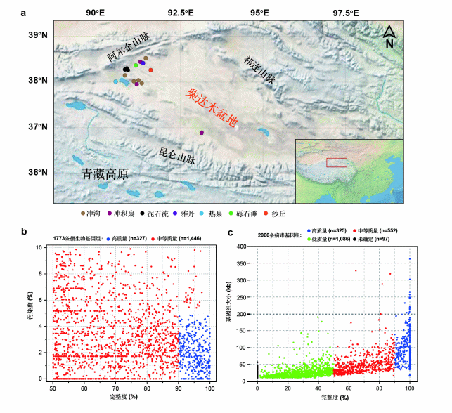 圖2 柴達(dá)木盆地微生物基因組數(shù)據(jù)庫。a.柴達(dá)木盆地采樣地點(diǎn)類型與位置;b.1773條細(xì)菌和古菌基因組質(zhì)量情況;c.2060條病毒基因組質(zhì)量情況