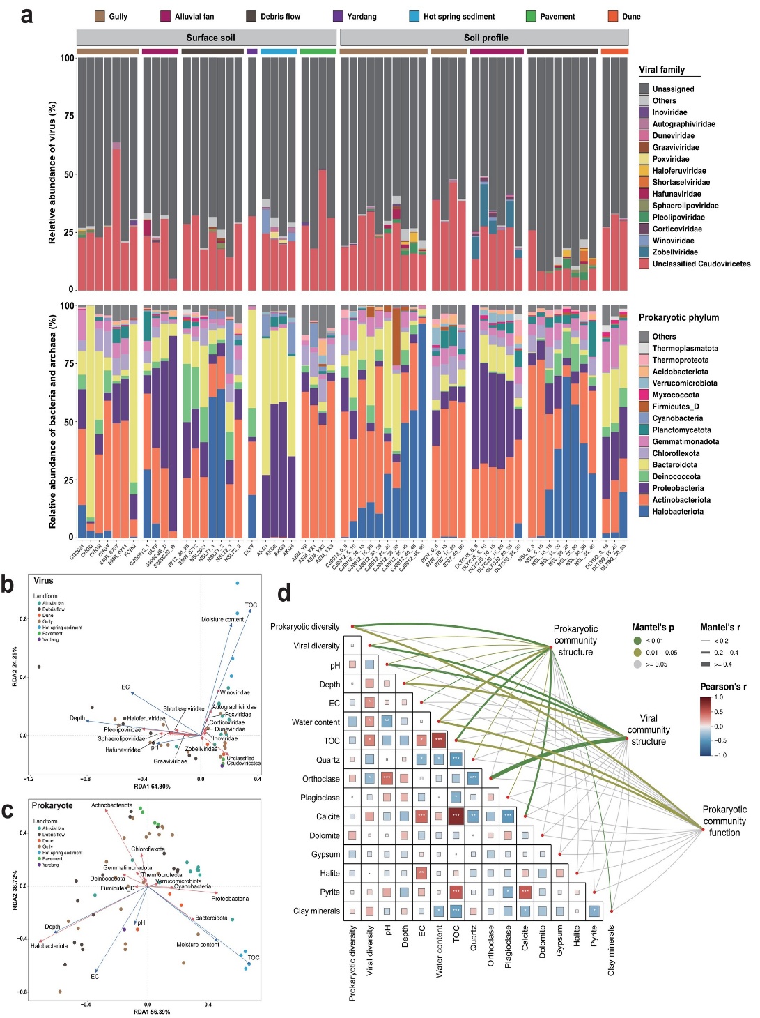 圖3 柴達(dá)木盆地原核生物(細(xì)菌和古菌)和病毒群落。a.原核生物和病毒群落組成;b.原核生物和病毒群落結(jié)構(gòu)和功能與各環(huán)境因子的相關(guān)性分析