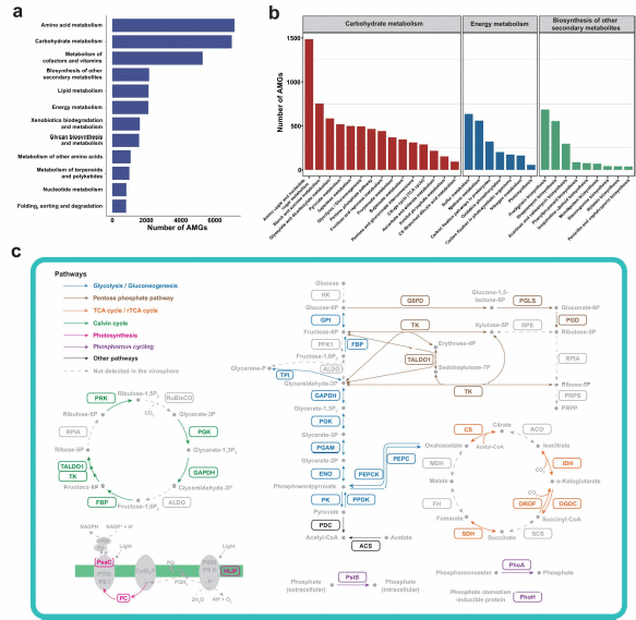 圖4 病毒宿主預(yù)測(cè)和輔助代謝基因鑒定。a.病毒-宿主關(guān)系預(yù)測(cè)結(jié)果;b.廣宿主病毒篩選;c.涉及生物地球化學(xué)循環(huán)通路的病毒輔助代謝基因鑒定