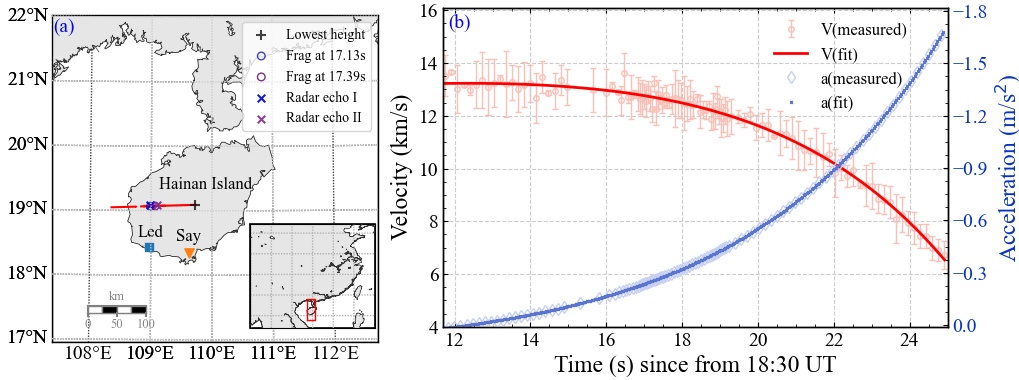 圖1?(a)MIOS系統(tǒng)監(jiān)測的流星事件M20221224_183010軌跡在地面的投影圖,紅線代表流星軌跡;(b)M20221224_183010流星速度隨時(shí)間的減速曲線。速度和加速度分別用紅色和藍(lán)色標(biāo)記