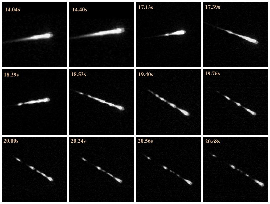 散布在太陽系中的流星體闖入地球大氣,會產(chǎn)生絢爛的流星現(xiàn)象。多數(shù)流星體在進(jìn)入地球大氣時(shí)會發(fā)生破碎,其形態(tài)受尺寸、速度和結(jié)構(gòu)等因素決定。破碎分為宏觀(大尺度、爆發(fā)式)與微觀(連續(xù))碎裂兩類。以往研究多聚焦于火球閃耀及其引發(fā)的尾跡效應(yīng),而對流星體持續(xù)碎裂及其引起的等離子體尾跡過程不甚清晰。研究不同母體來源流星體的成分、結(jié)構(gòu)和強(qiáng)度及其形成等離子體尾跡的過程,有助于揭示其母體天體及早期太陽系形成,以及其物質(zhì)注入地球大氣影響空間環(huán)境過程。 圍繞進(jìn)入地球空間的流星體來源,以及其蒸發(fā)、電離背景大氣、產(chǎn)生等離子體尾跡等全過程探測,中國科學(xué)院地質(zhì)與地球物理研究所空間環(huán)境探測實(shí)驗(yàn)室在海南研制建設(shè)了流星不均勻體多波段探測系統(tǒng)(MIOS),其包含光學(xué)和無線電雷達(dá)子系統(tǒng),可同時(shí)監(jiān)測流星光學(xué)軌跡、光譜和等離子體尾跡回波。2022年12月24日18時(shí)30分,該系統(tǒng)監(jiān)測到一顆慢速流星(事件編號M20221224_183010),以約13.2 km/s的初始速度自西向東飛行(圖1a),高度由81.0 km降至41.1 km,持續(xù)發(fā)光時(shí)間超過15秒。在此過程中,該流星經(jīng)歷了十余次非爆炸性碎裂(圖2),未出現(xiàn)典型閃耀,同時(shí)速度隨碎裂次數(shù)增加而明顯下降(圖1b)。軌道計(jì)算結(jié)果顯示,該流星體可能來源于阿波羅型小行星。
