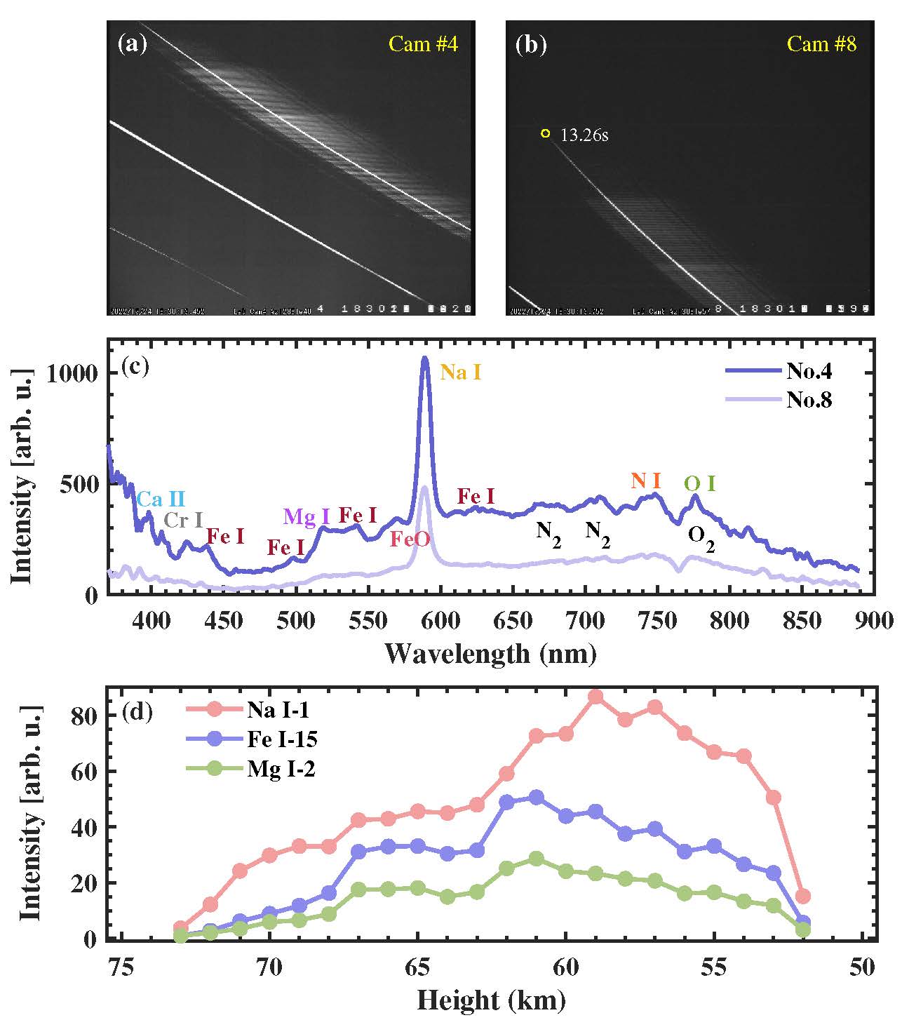 圖2?流星M20221224_183010碎裂階段的光學(xué)觀測圖像。圖像來自MIOS系統(tǒng)不同攝像機(jī)的觀測:?18:30,14.04s和14.40s(樂東9號相機(jī));17.13s和18.29s(三亞4號相機(jī));17.39s和18.53s(樂東1號相機(jī));以及19.40s、19.76s、20.00s、20.24s、20.56s和20.68s(樂東5號相機(jī)) MIOS系統(tǒng)的光譜觀測,揭示了該流星體豐富的元素特征,包括低溫譜線(約4500 K,如Cr I、Mg I、Fe I、Na I)和高溫譜線(約10000 K,如Ca II),同時(shí)檢測到大氣O I、N I吸收線及N?、O?分子帶(圖3a、圖3b)。在Na I線附近的556–577 nm波段上,觀測到與FeO發(fā)射一致的寬帶特征,表明可能存在Fe被臭氧氧化后產(chǎn)生的化學(xué)發(fā)光。流星體在進(jìn)入大氣層后,其原子發(fā)射譜通常由兩種機(jī)制產(chǎn)生:一是燒蝕過程中中性原子的熱激發(fā),二是高空金屬氧化物的化學(xué)發(fā)光(M+O3→MO+O2, MO+O→M+O2,M代表Na、Fe、Mg或Ca等金屬原子)。然而,該事例中觀測的光譜高度為74–52 km,顯著低于氧原子豐富的高層區(qū)域(80-105 km),化學(xué)發(fā)光過程受限。盡管該流星體的入射速度較低,流星表面溫度仍可升至約2000 K,足以使Na、Mg、Fe等元素汽化并通過熱碰撞被激發(fā)或部分電離,從而產(chǎn)生特征原子發(fā)射線。該事件中觀測到的Na I、Mg I 與 Fe I譜線可能主要源自燒蝕蒸汽的碰撞激發(fā)過程。此外,該流星光譜表現(xiàn)出強(qiáng)烈的Na I線,而Mg I線較弱,且未呈現(xiàn)典型的差異燒蝕規(guī)律(圖3c、圖3d)。這可能與其較低的入射速度有關(guān)。鈉的激發(fā)能僅約2.1 eV,易被激發(fā);而鎂Mg I 518.4 nm線需約5.1 eV激發(fā)能,在低速流星中較難形成強(qiáng)發(fā)射。
