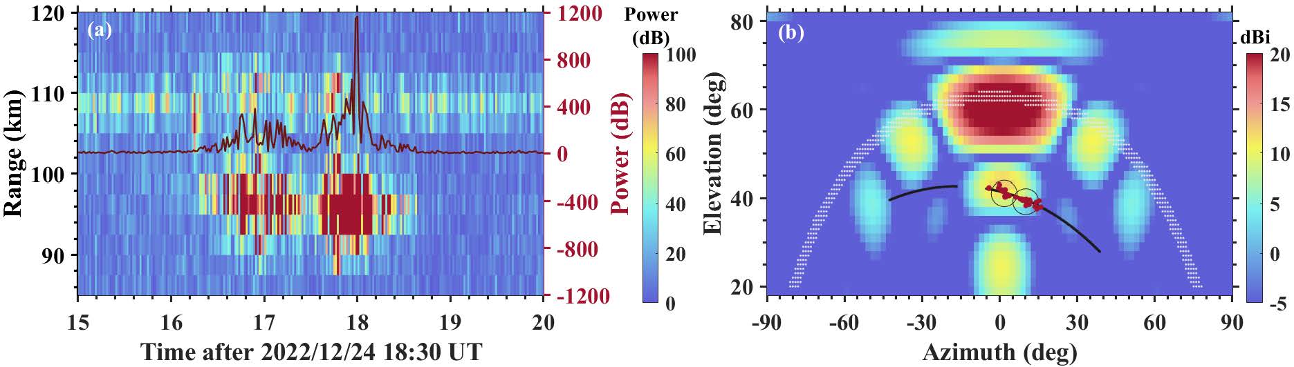 圖3 (a、b)MIOS系統(tǒng)的樂東4號和8號光譜相機(jī)記錄的流星體事件M20221224_183010的合成光譜。4號光譜相機(jī)中,±1級光譜位于零級(未色散)圖像兩側(cè),+1級在右側(cè)。8號光譜相機(jī)中,僅檢測到零級圖像和右側(cè)+1級光譜。流星的飛行方向從左上至右下;(c)沿流星軌跡積分的校正光譜強(qiáng)度;(d)4號光譜相機(jī)記錄的Na I-1、Fe I-15和Mg I-2的單色光曲線 在流星體持續(xù)碎裂的過程中,MIOS系統(tǒng)的雷達(dá)觀測顯示在64 km與60 km高度存在兩個短暫而強(qiáng)烈的非場向等離子體不均勻體回波(圖4),遠(yuǎn)低于流星不均勻體通常出現(xiàn)的95-110 km范圍。這兩團(tuán)不均勻體回波與流星體碎裂時(shí)間和空間位置高度吻合。研究推測,流星體的持續(xù)碎裂為低層大氣中形成此類非場向等離子體結(jié)構(gòu)提供了條件。碎裂過程中不斷釋放的細(xì)小塵埃顆粒能快速帶電,形成塵埃等離子體,促進(jìn)布拉格尺度電子密度結(jié)構(gòu)的形成,導(dǎo)致顯著的雷達(dá)后向散射??紤]到60 km高度處的背景電離層電子密度非常低,塵埃帶電所需的自由電子可能主要由流星體燒蝕過程提供。對于慢速流星,具有最低電離勢的元素(尤其是Na)可能對自由電子總量作出了顯著貢獻(xiàn)。 這類在低高度持續(xù)碎裂并產(chǎn)生非場向等離子體不均勻結(jié)構(gòu)的流星事件,揭示了流星體持續(xù)破碎在塑造地球中間層等離子體結(jié)構(gòu)中的重要作用,表明伴隨流星體碎裂直接產(chǎn)生的塵埃顆粒及其帶電過程可能是近地空間塵埃等離子體結(jié)構(gòu)形成的一種重要方式。