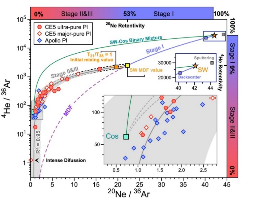 圖2 輕稀有氣體(He、Ne、Ar)的同位素與元素演化過(guò)程。三個(gè)階段:在階段I,斜長(zhǎng)石顆粒最初受到太陽(yáng)風(fēng)和宇宙射線(xiàn)的共同照射。太陽(yáng)風(fēng)粒子注入礦物表面的瞬間,就已經(jīng)發(fā)生了同位素和元素比例的分餾,而宇宙射線(xiàn)產(chǎn)生的氣體幾乎未受影響(此時(shí)T21/T38≈1)。在階段II,月球表面的溫度波動(dòng)或微隕石撞擊可能引發(fā)熱擾動(dòng),使部分氣體發(fā)生擴(kuò)散并逃逸。這一過(guò)程對(duì)太陽(yáng)風(fēng)起源的氣體和宇宙成因氣體都有不同程度的影響,導(dǎo)致稀有氣體豐度進(jìn)一步改變。在階段III,氣體重新被輻照的情況取決于顆粒的埋藏深度。暴露在月壤表面的顆粒(主要對(duì)應(yīng)嫦娥五號(hào)樣品)重新獲取了太陽(yáng)風(fēng)和宇宙射線(xiàn)成分;而埋藏較深、受到太陽(yáng)風(fēng)屏蔽的顆粒(主要對(duì)應(yīng)阿波羅樣品)則僅積累了宇宙射線(xiàn)產(chǎn)生的氣體