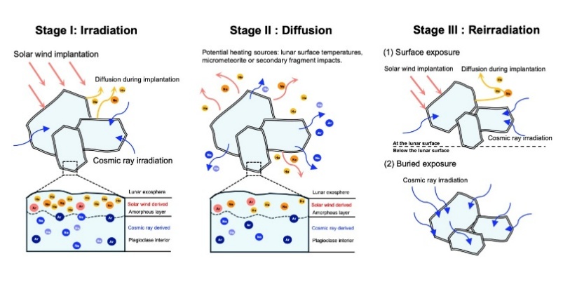 通過(guò)結(jié)合嫦娥五號(hào)與阿波羅斜長(zhǎng)石樣品的結(jié)果,研究團(tuán)隊(duì)提出了一個(gè)三階段模型:太陽(yáng)風(fēng)與宇宙射線(xiàn)輻照注入、局部熱驅(qū)動(dòng)擴(kuò)散及再輻照(圖2;以上三個(gè)階段可能多次發(fā)生)。這一模型能系統(tǒng)地解釋月壤中輕稀有氣體的豐度變化與同位素特征。研究指出太陽(yáng)風(fēng)注入與氣體逃逸并非獨(dú)立過(guò)程。部分輕元素(如He、Ne、H、OH等)在注入瞬間可能會(huì)因礦物表面的晶格損傷而發(fā)生瞬時(shí)擴(kuò)散釋放到月球外逸層,提供穩(wěn)定的、具有太陽(yáng)風(fēng)組成的氣體來(lái)源。微隕石撞擊及晝夜溫差造成的短時(shí)高溫也進(jìn)一步促進(jìn)了氣體的釋放(擴(kuò)散)過(guò)程,使不同顆粒間稀有氣體的豐度出現(xiàn)更顯著的差異。這些機(jī)制為月球外逸層中持續(xù)存在的太陽(yáng)風(fēng)來(lái)源氣體提供了新的解釋。并且,太陽(yáng)風(fēng)注入時(shí)和注入后的擴(kuò)散損失與太陽(yáng)風(fēng)的再輻照過(guò)程共同構(gòu)成了將太陽(yáng)風(fēng)來(lái)源的揮發(fā)分從月球低溫光照區(qū)輸送至月球極區(qū)冷阱的有效途徑。極區(qū)冷阱的揮發(fā)分極有可能存在太陽(yáng)風(fēng)來(lái)源的組分。研究同時(shí)強(qiáng)調(diào),在利用月球樣品重建太陽(yáng)風(fēng)組成時(shí),必須考慮這些過(guò)程引起的系統(tǒng)性偏移。只有在校正相關(guān)分餾效應(yīng)后,才能準(zhǔn)確利用月球及其他地外樣品評(píng)估過(guò)去太陽(yáng)風(fēng)的初始組成與太陽(yáng)的演化趨勢(shì)。