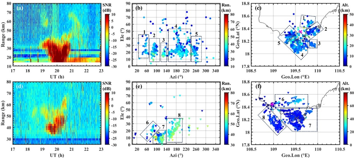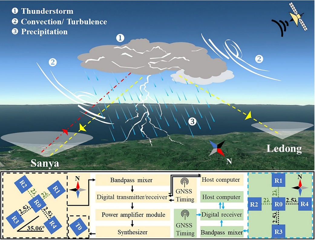 針對這一挑戰(zhàn),中國科學院地質與地球物理研究所空間環(huán)境探測實驗室劉建飛等人基于VHF波段的全天空流星雷達進行技術開發(fā),利用其全天空大視場探測能力,結合多基地定位技術,發(fā)展了在低層大氣中探測和追蹤雷暴的新方法(如圖1)。該技術以三亞雷達為收發(fā)站,樂東雷達為接收站,構建了雙基地干涉探測系統(tǒng),獲得了跨圈層同步觀測能力。