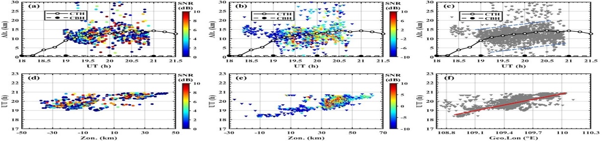 基于該技術,成功對2024年6月5日發(fā)生于海南地區(qū)的雷暴過程進行了跟蹤觀測。雙基地系統(tǒng)同步捕獲了低距離門的高信噪比回波(圖2a、圖2d),到達角分布均指向海南島西南沿海方向(圖2b、圖2e)。干涉定位結果表明(圖2c、圖2f),兩臺雷達觀測到的是同一雷暴活動,且與單站定位相比,雙基地系統(tǒng)展現(xiàn)出多重優(yōu)勢:可通過交叉驗證有效提高定位精度;能夠通過相互補償探測盲區(qū)來擴大覆蓋范圍;并可利用重疊觀測區(qū)域保持觀測的時空連續(xù)性。此外,該系統(tǒng)還能揭示雷暴的垂直發(fā)展結構(圖3)。觀測顯示,19:00 UT至21:00 UT期間,回波上下邊界高度顯著上升,與云頂高度變化趨勢一致。結合云頂高度在18:15 UT后的驟升及后續(xù)的持續(xù)抬升過程,觀測結果清晰反映了對流活動與雷暴增強過程。