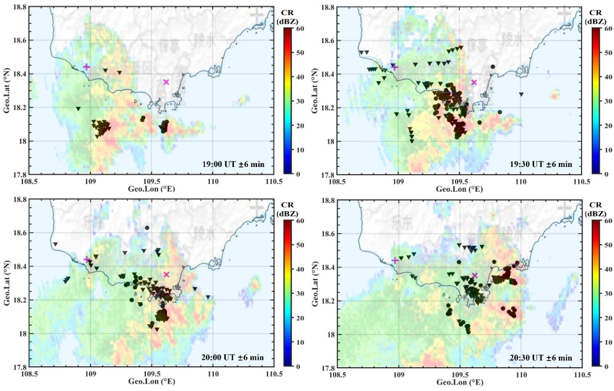 為精細解析雷暴演變過程,研究將雙基地全天空雷達在四個時刻觀測的散射回波與組合反射率圖進行疊加對比(圖4)。結果顯示,19:00 UT兩臺雷達分別在各自站點南側觀測到雷暴回波。隨后至20:00 UT,回波結構持續(xù)向東北移動,與對流云團移動方向一致。20:30 UT后,對流云團逐漸移出樂東雷達探測范圍,回波由三亞雷達持續(xù)跟蹤。整個過程中雙基地系統(tǒng)觀測的雷暴空間演變與40–50 dBZ的高組合反射率的雷暴核心區(qū)移動軌跡高度一致,有效驗證了全天空流星雷達在追蹤雷暴活動方面的有效性與準確性。