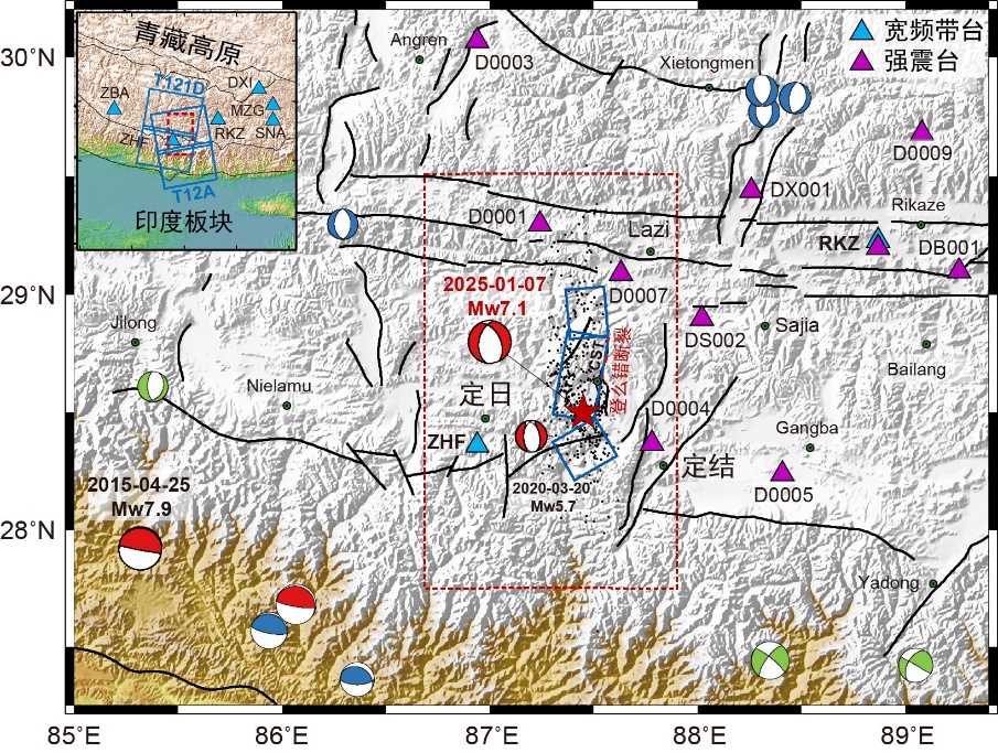 2025年1月7日,西藏定日縣發(fā)生矩震級(jí)Mw7.1的地震(以下簡(jiǎn)稱“定日地震”),震中位于青藏高原南部申扎-定結(jié)裂谷系南段,鄰近登么錯(cuò)斷裂(圖1)。定日地震是自1976年以來該區(qū)域發(fā)生的最大震級(jí)正斷層型事件,也是一次發(fā)生在青藏高原內(nèi)的震源極淺M7級(jí)以上正斷層型地震,為理解高原伸展構(gòu)造及相關(guān)地震破裂機(jī)制提供了重要契機(jī)。
