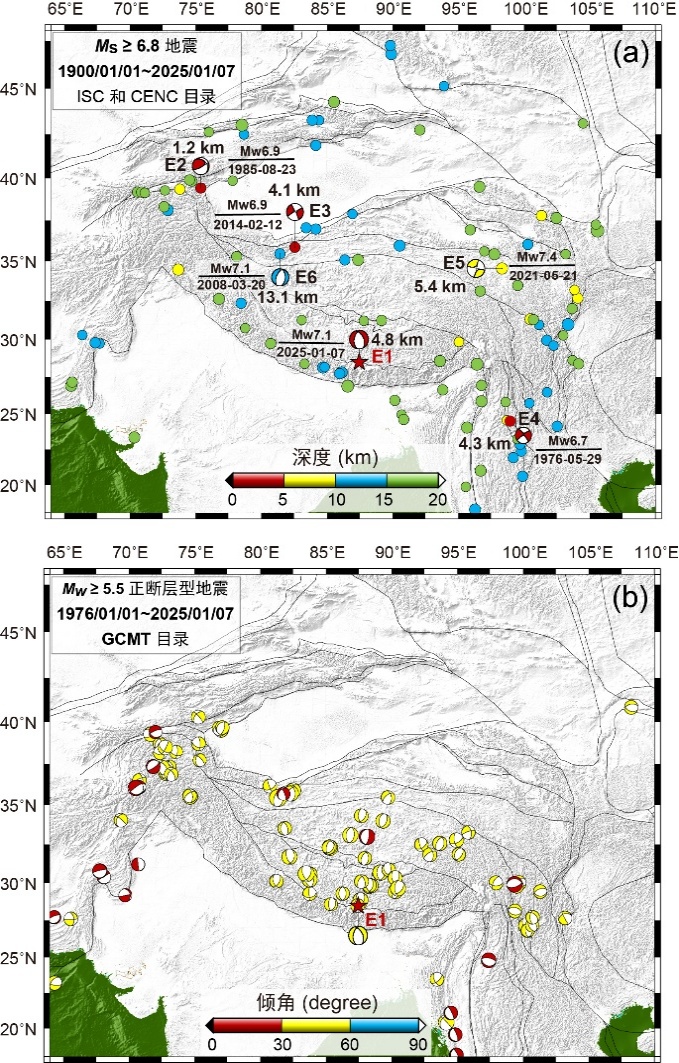 圖2?青藏高原歷史地震深度與傾角分布圖。(a)?Ms?≥ 6.8地震深度分布,圓圈顏色代表深度;(b)?Mw?≥ 5.5正斷層型地震的傾角分布,震源球顏色代表傾角。圖中E1代表本次定日地震