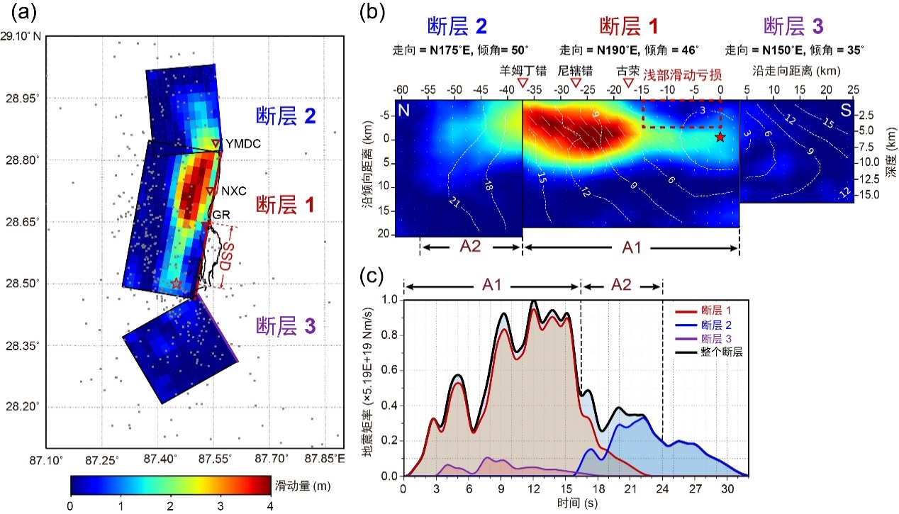 圖3?定日地震同震滑動(dòng)位移分布。(a)?滑動(dòng)位移在地表的投影。紅色五角星為主震震中,黑點(diǎn)為余震震中。(b)?滑動(dòng)位移沿?cái)鄬幼呦蚝蜕疃确较虻姆植?。白色等值線表示破裂前鋒傳播時(shí)間(單位:秒),紅色虛線框標(biāo)示淺部滑動(dòng)虧損區(qū)。(c)地震矩率隨時(shí)間變化