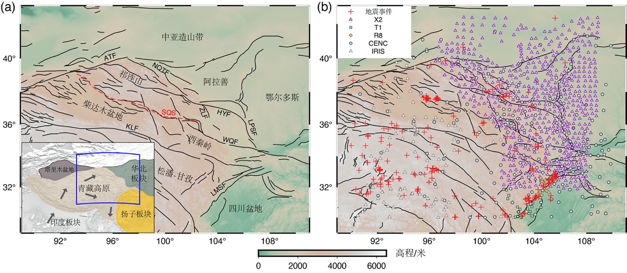 圖1 青藏高原東北緣及鄰近地區(qū)地表地形及震中、臺(tái)站的分布。(a)含主要構(gòu)造邊界和斷層的區(qū)域地形圖,其中插圖顯示了區(qū)域構(gòu)造框架、研究區(qū)位置(藍(lán)框)以及印度板塊和青藏高原的運(yùn)動(dòng)方向(深灰色箭頭,引自M. Wang and Shen, 2020)。斷層和縫合線名稱縮寫如下:ATF,阿爾金斷裂;HYF,海原斷裂;KLF,昆侖斷裂;LMSF,龍門山斷裂;LPSF,六盤山斷裂;NQTF,北祁連逆沖斷層;SQS,南祁連縫合帶;WQF,西秦嶺斷層;ZLF,莊浪河斷層;(b)地震事件(紅叉)和臺(tái)站分布圖。這些臺(tái)站來自中國地震科學(xué)臺(tái)陣探測-喜馬拉雅II期臺(tái)陣(X2)、寬頻帶流動(dòng)地震臺(tái)陣(T1)、汶川地震震后臨時(shí)觀測臺(tái)陣(R8)、中國國家地震臺(tái)網(wǎng)和區(qū)域臺(tái)網(wǎng),以及全球地震臺(tái)網(wǎng)