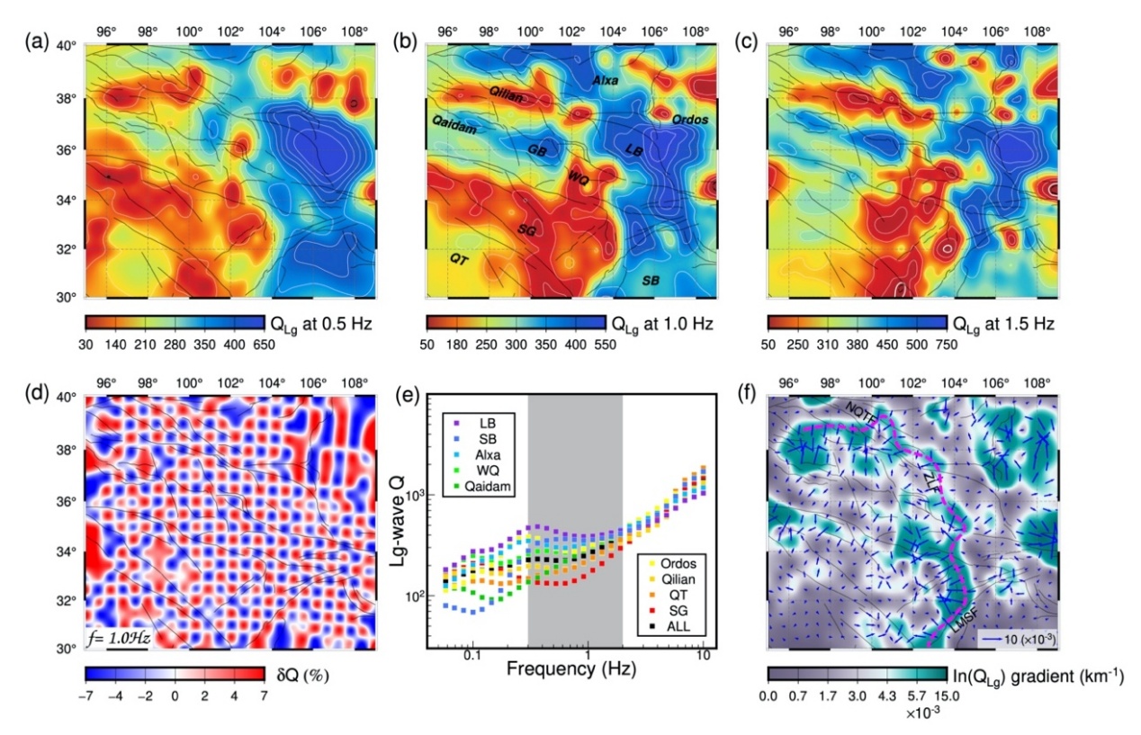 中國科學(xué)院地質(zhì)與地球物理研究所行星科學(xué)與前沿技術(shù)重點(diǎn)實(shí)驗(yàn)室地震學(xué)學(xué)科組的博士研究生李若婕、導(dǎo)師姚振興院士和趙連鋒研究員、何熹博士后,以及美國加州大學(xué)圣克魯茲分校的謝小碧研究員一起,利用青藏高原東北緣及附近地區(qū)固定臺(tái)網(wǎng)和ChinArray喜馬拉雅II期的高密度觀測資料,建立了高分辨率(0.5°×0.5°)寬頻帶地殼Lg波衰減模型(圖2),為區(qū)域地殼物質(zhì)逃逸機(jī)制和高原擴(kuò)張邊界提供了新的約束。