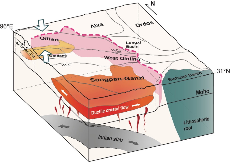 圖4 青藏高原東北緣可能的動(dòng)力學(xué)機(jī)制示意圖。紅色中下地殼內(nèi)的白色箭頭指示了潛在的韌性地殼流的擠出方向;灰色箭頭表示可能的印度板片的東北向俯沖。綠色空心箭頭和黑色細(xì)箭頭表示祁連造山帶的水平縮短和垂直抬升(修改自Feng et al.,2020)。紫紅色虛線代表由高QLg梯度推測的高原東北緣地殼尺度的高原擴(kuò)展邊界