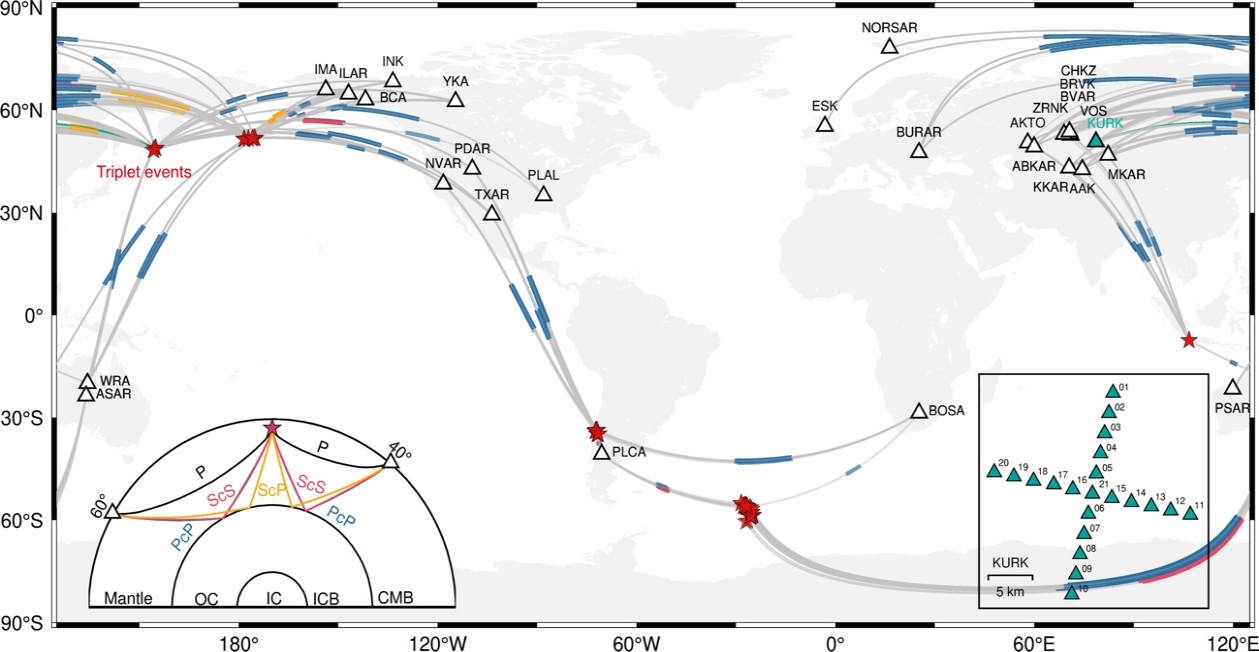 圖1?全球重復(fù)地震與中–小孔徑地震臺(tái)陣之間核反射震相在CMB上的采樣點(diǎn)分布示意圖。左下角插圖為震源深度300公里條件下PcP、ScP和ScS震相在震中距40°與60°時(shí)的射線路徑對(duì)比,右下角插圖為KURK小孔徑臺(tái)陣的幾何分布