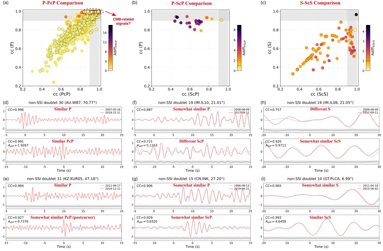 針對(duì)這一問(wèn)題,中國(guó)科學(xué)院地質(zhì)與地球物理研究所行星科學(xué)與前沿技術(shù)重點(diǎn)實(shí)驗(yàn)室崔天宇博士后與王巍特聘研究員、合作導(dǎo)師艾印雙研究員及其他合作者共同開展研究,基于前人構(gòu)建的全球重復(fù)地震目錄(Yang and Song, 2023),系統(tǒng)分析了全球尺度CMB非均勻結(jié)構(gòu)及其地形潛在時(shí)變特征。該研究系統(tǒng)收集了全球中-小孔徑臺(tái)陣記錄到的重復(fù)地震的前臨界核反射震相(PcP、ScP和ScS),最終篩選出含1320對(duì)PcP、82對(duì)ScS以及22對(duì)ScP波形對(duì)的高質(zhì)量研究數(shù)據(jù)集。該數(shù)據(jù)集覆蓋廣泛的震中距范圍,空間上分布于歐亞大陸北部、環(huán)太平洋地區(qū)、南極及東南亞等地區(qū)(圖1),重復(fù)地震對(duì)的時(shí)間間隔從數(shù)年至二十余年不等,為約束CMB潛在的時(shí)間變化提供了可靠的數(shù)據(jù)觀測(cè)基礎(chǔ)。研究團(tuán)隊(duì)對(duì)上述核反射震相的波形相似性及振幅相對(duì)變化進(jìn)行了系統(tǒng)分析,并進(jìn)一步對(duì)直達(dá)P波和S波開展對(duì)比研究,以評(píng)估震源復(fù)雜性、淺部結(jié)構(gòu)非均勻性及背景噪聲對(duì)觀測(cè)結(jié)果的潛在影響。