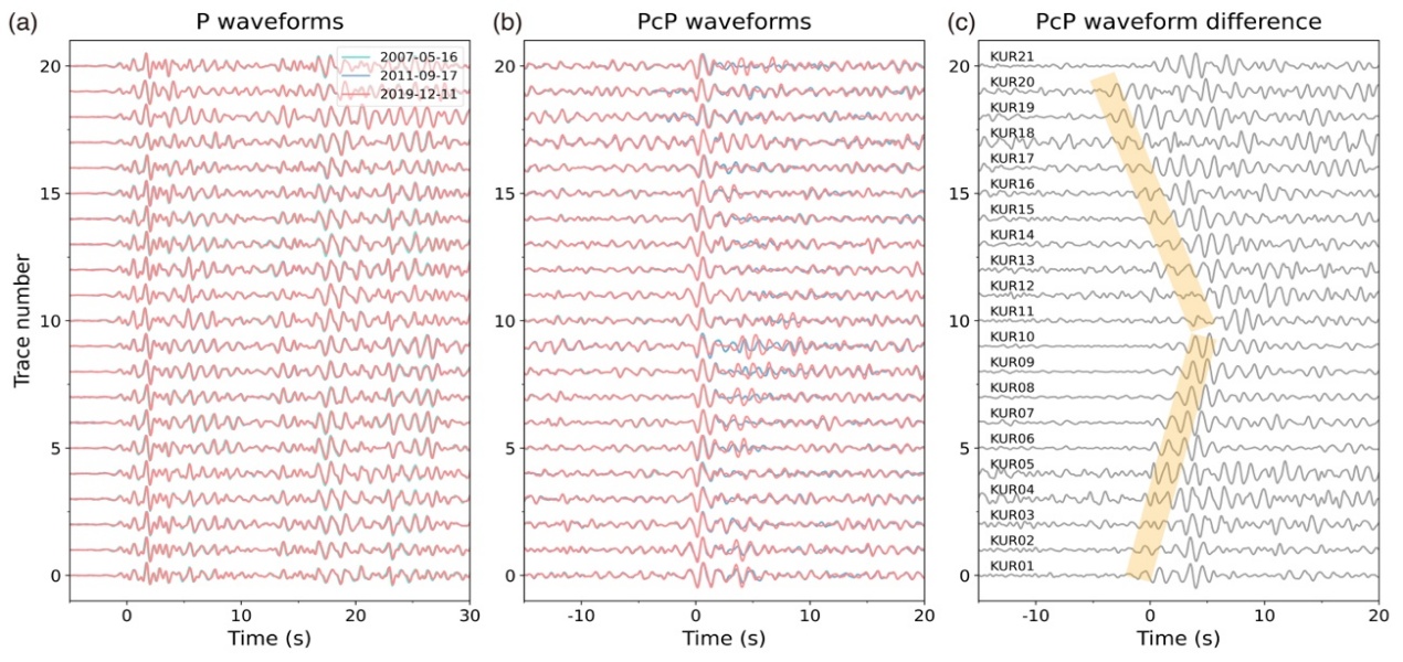 研究結(jié)果表明,ScP與ScS震相整體波形相似性較低,且缺乏直達(dá)P或S波高度相似(CC≥0.99)的穩(wěn)定事件對(duì);結(jié)合振幅特征分析,未能可靠識(shí)別出CMB潛在的時(shí)變信號(hào),觀測(cè)差異更可能受震源復(fù)雜性或噪聲影響。相比之下,1320對(duì)PcP提供了更密集的全球采樣,整體上PcP與直達(dá)P波相似性呈正相關(guān),多數(shù)差異可歸因于震源或淺部結(jié)構(gòu)等因素,但少數(shù)異常樣例在初步分析中表現(xiàn)出潛在的CMB相關(guān)特征(圖2)。這些異常主要源于同一小孔徑KURK臺(tái)陣記錄的三次重復(fù)地震,其中2019年事件的PcP波形相較2007年和2011年呈現(xiàn)系統(tǒng)性差異,而直達(dá)P波保持高度一致(圖3);進(jìn)一步的臺(tái)陣分析表明,該潛在時(shí)變信號(hào)實(shí)為來(lái)自不同傳播方向的近震地震信號(hào)干擾,而非CMB結(jié)構(gòu)或地形的真實(shí)變化(圖4)。在當(dāng)前觀測(cè)精度與時(shí)間尺度范圍內(nèi),采樣區(qū)域未能可靠識(shí)別CMB附近結(jié)構(gòu)或地形的潛在時(shí)變信號(hào),呈現(xiàn)出相對(duì)穩(wěn)定的特征。因此,研究團(tuán)隊(duì)認(rèn)為其動(dòng)力學(xué)演化過(guò)程可能發(fā)生在數(shù)十年甚至更長(zhǎng)的時(shí)間尺度上,或者其瞬態(tài)變化幅度低于當(dāng)前地震觀測(cè)手段的分辨能力。這一結(jié)果對(duì)約束CMB附近的動(dòng)力學(xué)演化狀態(tài)具有重要意義。