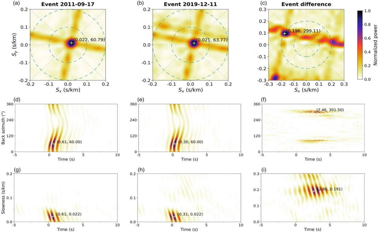圖4?重復(fù)地震fk與速度譜分析中慢度與反方位角結(jié)果。(a)2011年地震事件的觀測(cè)fk歸一化功率譜,白色十字標(biāo)示主到達(dá)波的水平慢度和反方位角;(b)同(a),為2019年事件;(c)兩次事件fk功率譜之差。(d–f)分別為2011年、2019年及其差值的反方位角速度譜;(g–i)為對(duì)應(yīng)的慢度速度譜