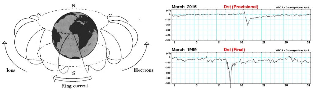 圖1 (左)地球磁層西向環(huán)電流形成示意圖;(右)增強(qiáng)的西向環(huán)電流引起地球空間磁暴,造成地表地磁場(chǎng)強(qiáng)度下降