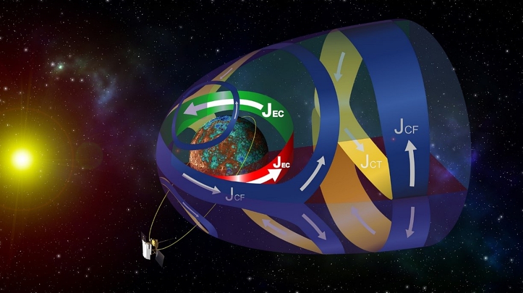 通過(guò)對(duì)信使號(hào)近4年的磁場(chǎng)統(tǒng)計(jì)分析,他們的研究顯示水星磁層內(nèi)部并不存在類似于地球磁層的西向電流環(huán)帶;然而卻驚人地發(fā)現(xiàn)在水星夜側(cè)磁赤道附近,~500-1000 km高度范圍內(nèi)存在一個(gè)明顯的東向電流(JEC,圖2)。該東向電流主要集中在磁赤道面上,自西向東運(yùn)轉(zhuǎn),并與向陽(yáng)面的磁層頂電流(JCF)閉合形成回路。進(jìn)一步的模擬研究不僅證實(shí)了他們的分析結(jié)論,而且還顯示出該東向電流能永久性地存在于任意太陽(yáng)風(fēng)條件下。