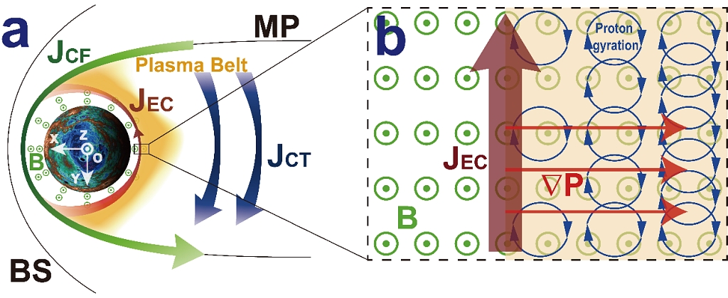 結(jié)合模擬及相關(guān)分析計(jì)算,他們提出了東向電流的形成機(jī)理(圖3):太陽(yáng)風(fēng)離子通過(guò)擴(kuò)散作用從磁層兩側(cè)進(jìn)入水星磁層,在磁場(chǎng)的引導(dǎo)作用下,在夜側(cè)磁赤道面附近形成準(zhǔn)捕獲等離子體帶;在等離子體帶的內(nèi)側(cè),徑向向外的等離子體壓力梯度與磁場(chǎng)共同驅(qū)動(dòng)了東向抗磁電流。