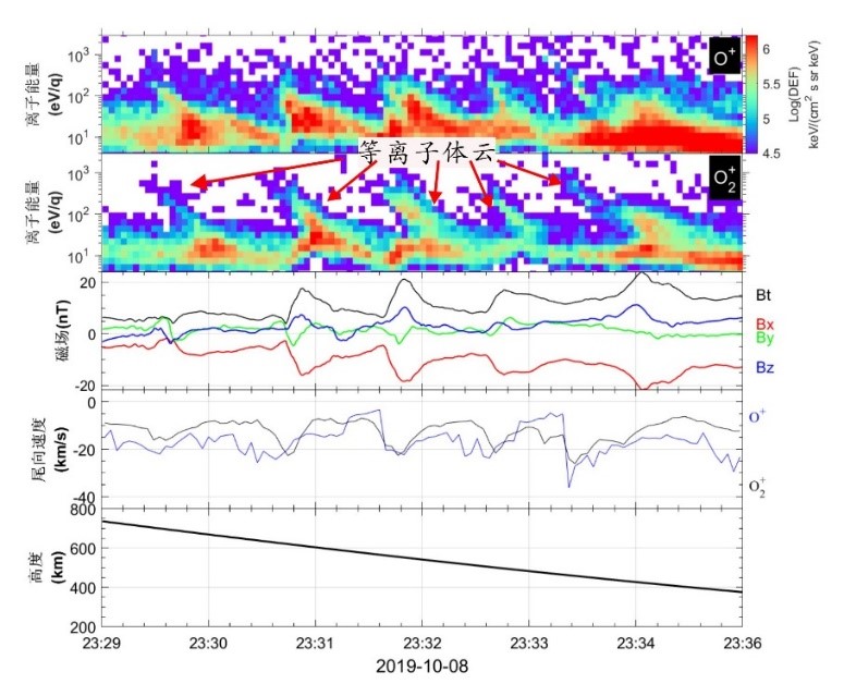 不同于以往的研究,該周期性低高度的“等離子體云”結(jié)構(gòu)顯示出一系列新的觀測特征:離子能譜呈現(xiàn)出色散特征(能量高的離子可較早被觀測到),不同火星離子成分具有大致相同的速度,且等離子體云的出現(xiàn)會伴隨著總磁場增加,以及強的太陽風電子沉降特征。分析結(jié)果表明這些等離子體云是起源于低高度電離層區(qū)域(~120 km高度),沿著開放磁力線尾向逃逸。且估算表明,在該事件中“等離子體云”可顯著提高火星大氣離子的逃逸率。這表明“等離子體云”是火星大氣離子逃逸的一種主要方式。