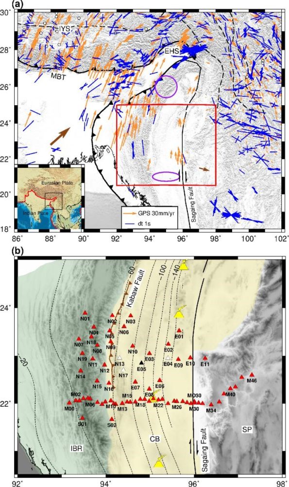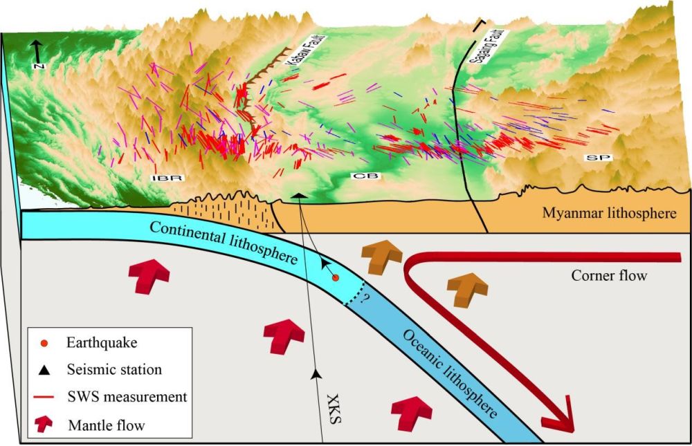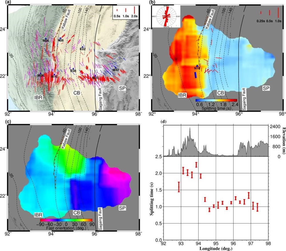 中國科學(xué)院地質(zhì)與地球物理所地球與行星物理院重點(diǎn)實(shí)驗(yàn)室博士生范恩博與導(dǎo)師艾印雙研究員、何玉梅研究員及美國密蘇里科技大學(xué)Stephen S. Gao教授等人,基于2016年地質(zhì)地球所和緬甸地球科學(xué)學(xué)會(huì)、青藏高原研究所合作在緬甸中部布設(shè)的該國第一個(gè)密集流動(dòng)地震臺(tái)陣所采集回的高質(zhì)量數(shù)據(jù)(圖1b),在XKS震相剪切波分裂分析的基礎(chǔ)上,輔以近震直達(dá)剪切波分裂和接收函數(shù)中Pms震相分析,系統(tǒng)研究了該區(qū)域各向異性的空間變化和主要來源深度,初步建立了研究區(qū)深部動(dòng)力學(xué)模型。