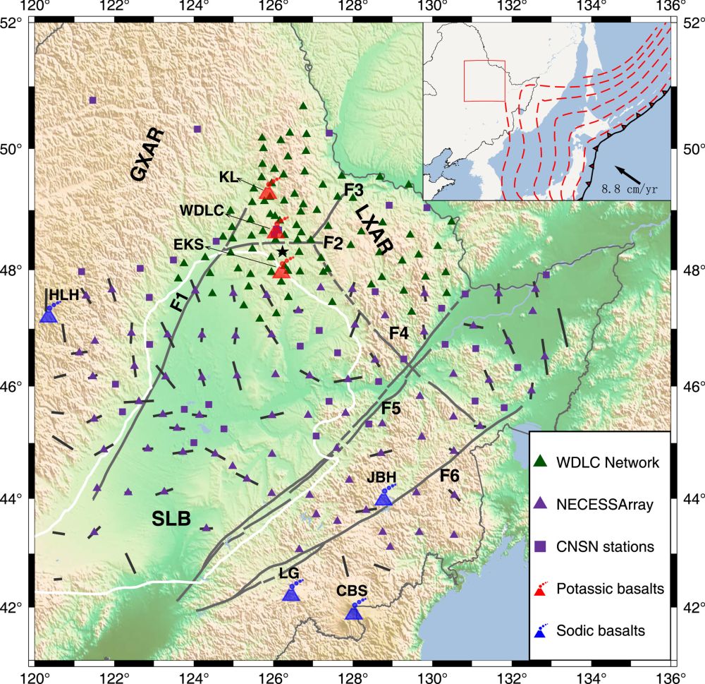 圖1 中國東北地區(qū)地質簡圖?;疑€表示主要斷裂,F1:嫩江斷裂,F2:訥謨河斷裂,F3:孫吳斷裂,F4:遜克-鐵力斷裂;F5:依蘭-伊通斷裂和F6:敦化-密山斷裂。綠色和紫色三角以及紫色方塊表示臺站分布?;鹕椒柋硎净鹕?,KL:科洛火山,WDLC:五大連池火山,EKS:二克山火山,HLH:哈拉哈火山,LG:龍崗火山,JBH:鏡泊湖火山和CBS:長白山火山