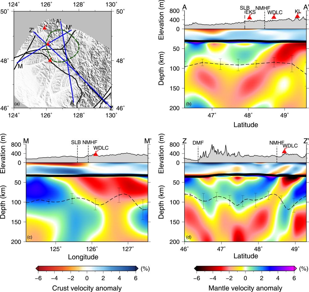 中國科學院地質與地球物理研究所地球與行星物理院重點實驗室博士生陳瑛(已畢業(yè))與艾印雙研究員和姜明明副研究員等人,聯(lián)合利用研究所地球內部結構學科組與國家自然災害防治研究院在五大連池火山及臨近二克山火山和科洛火山(五大連池火山群)布設的密集地震臺陣觀測數(shù)據(jù),采用背景噪聲和雙平面波聯(lián)合成像方法建立了研究區(qū)域高精度的殼幔三維剪切波速度模型(圖2)。成像結果顯示在五大連池、二克山和科洛火山下方上地幔頂部至100 km深度存在唯一的通道狀低速異常體,該低速異常體與100~200 km深度的低速軟流圈連接。結合前人研究結果,推斷這三個火山是同一幔源火山。