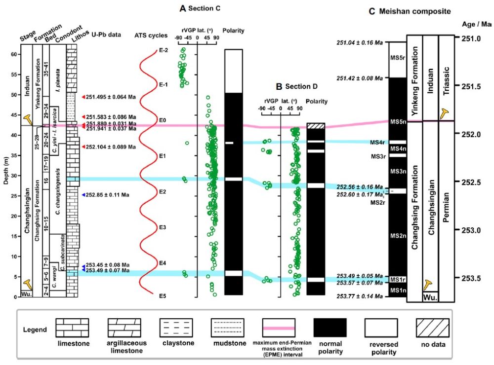 研究人員在煤山D剖面和C剖面共采集649塊定向古地磁樣品。實驗最大的挑戰(zhàn)在于灰?guī)r的天然剩磁極弱(<1×10-5A/m)。使用古地磁與年代學(xué)實驗室最新自主研發(fā)的TD-PGL-100熱退磁爐(爐內(nèi)殘余場<5nT)進行系統(tǒng)熱退磁實驗,利用高靈敏度Rapid 2G低溫超導(dǎo)磁力儀測量剩磁。在煤山剖面長興階和印度階早期共識別5個正極性帶(命名為MS1n~MS5n)和5個負(fù)極性帶(命名為MS1r~MS5r)(圖2)。煤山剖面印度階早期由兩個磁極性帶組成,頂部為負(fù)極性帶MS5r,底部為正極性帶MS5n;長興階以正極性帶為主,在底部和上部存在四個短期的負(fù)極性帶(MS1r~MS4r)??梢?,在海相地層中,晚二疊世生物大滅絕事件(EPME)及二疊紀(jì)-三疊紀(jì)界線(PTB)均位于正極性帶MS5n底部,長興階-吳家坪階界線位于正極性帶MS1n中。