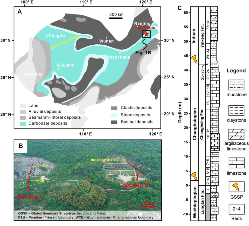 晚二疊世生物大滅絕事件(EPME)是顯生宙最嚴(yán)重的一次生物滅絕事件,導(dǎo)致了超過80%海洋生物種的消失,同時重創(chuàng)了陸地生態(tài)系統(tǒng)。浙江長興縣煤山剖面主要為淺海相-斜坡相生物碎屑灰?guī)r,完整記錄了晚二疊世海相生物滅絕過程;該剖面包括了二疊紀(jì)-三疊紀(jì)界線(PTB)和長興階-吳家坪階界線兩個“金釘子”( GSSP)(圖1),因此在國際晚二疊世生物大滅絕研究中至關(guān)重要。在過去三十多年,國內(nèi)外學(xué)者在煤山剖面做了大量工作,包括高精度CA-ID-TIMS U-Pb定年、磁性地層、化學(xué)地層、生物地層以及旋回地層,為全球海相地層對比提供了依據(jù),深化了對晚二疊世生物大滅絕的認(rèn)識。