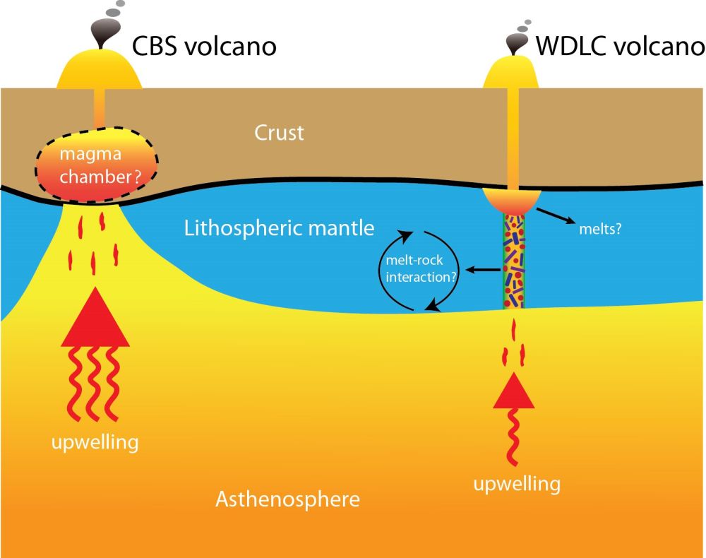 圖3 刻畫長白山火山和五大連池火山不同成因機制的卡通圖