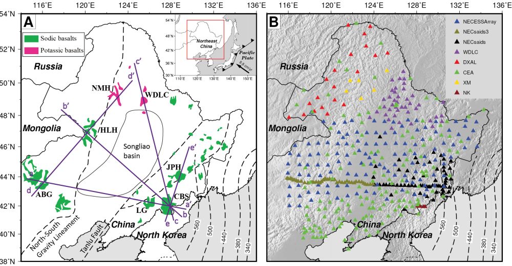中國東北地區(qū)松遼盆地北緣及其東西兩翼發(fā)育眾多的第四紀(jì)板內(nèi)火山,包括長白山火山、龍崗火山、鏡泊湖火山、阿巴嘎火山、哈拉哈火山、五大連池火山、諾敏河火山等(圖1A)。這些年輕板內(nèi)火山的形成機制及其深部動力學(xué)過程是涉及西太平洋地球系統(tǒng)多圈層相互作用的核心科學(xué)問題,也是推進解決與板塊深俯沖相關(guān)重大地球科學(xué)問題的關(guān)鍵。前人的大尺度地震層析成像、火山巖石地球化學(xué)以及地球動力學(xué)模擬等研究揭示東北地區(qū)板內(nèi)火山的形成與西太平洋板塊向歐亞大陸俯沖并滯留于地幔轉(zhuǎn)換帶的過程密切相關(guān)。然而,已有研究難以解釋東北地區(qū)第四紀(jì)玄武巖為何會在地球化學(xué)屬性上表現(xiàn)出顯著的空間差異性(圖1A)——位于松遼盆地北緣的五大連池和諾敏河等局部區(qū)域出露典型的高鉀玄武巖,與東北地區(qū)其它普通鈉質(zhì)火山巖相比在元素地球化學(xué)性質(zhì)上呈現(xiàn)出多方面的異常特征。針對這些高鉀玄武巖的成因,已有的巖石學(xué)和地球化學(xué)研究結(jié)果仍存在很大爭議,不同研究分別提出了巖石圈地幔、軟流圈地幔和地幔轉(zhuǎn)換帶等多種巖漿起源模式。