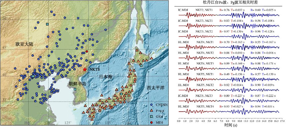 圖1 用于朝鮮地下核試驗(yàn)定位的區(qū)域地震臺(tái)網(wǎng)(左)和利用互相關(guān)方法由牡丹江臺(tái)對(duì)不同核爆事件觀測到的Pn波和Pg波的相對(duì)到時(shí)差(右)
