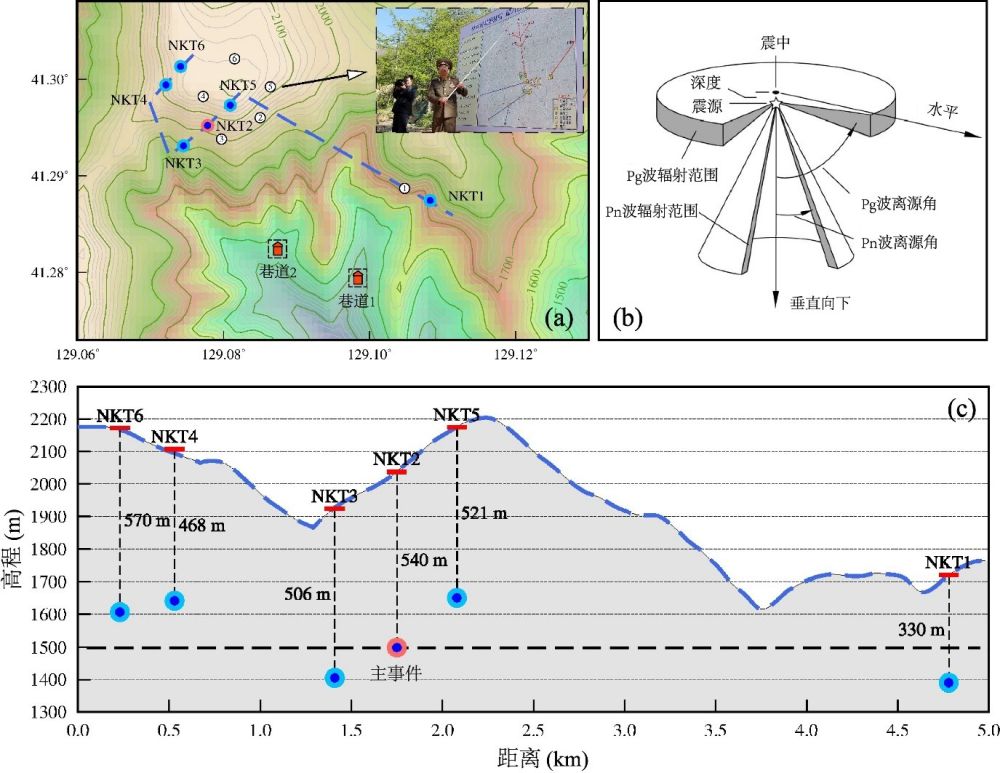 圖2 (a)朝鮮6次地下核試驗(yàn)水平定位結(jié)果(藍(lán)色圓點(diǎn)),以及與朝鮮官方公布結(jié)果的比較(白色圓圈+數(shù)字);(b)Pn和Pg波能量離源角范圍及其對(duì)深度敏感性的示意圖;(c)朝鮮6次核試驗(yàn)的埋藏深度估計(jì)