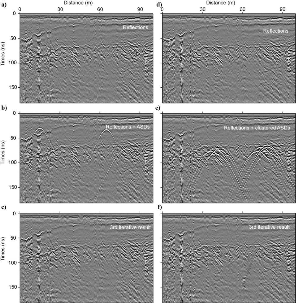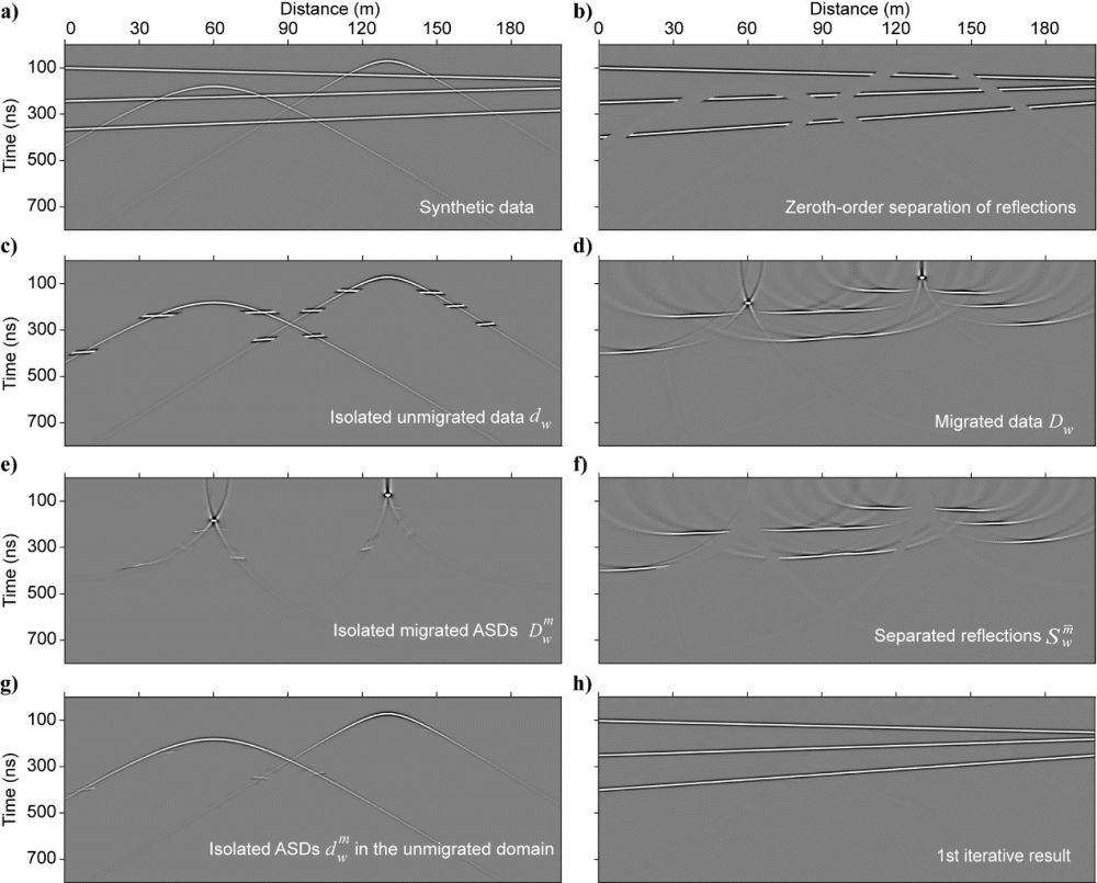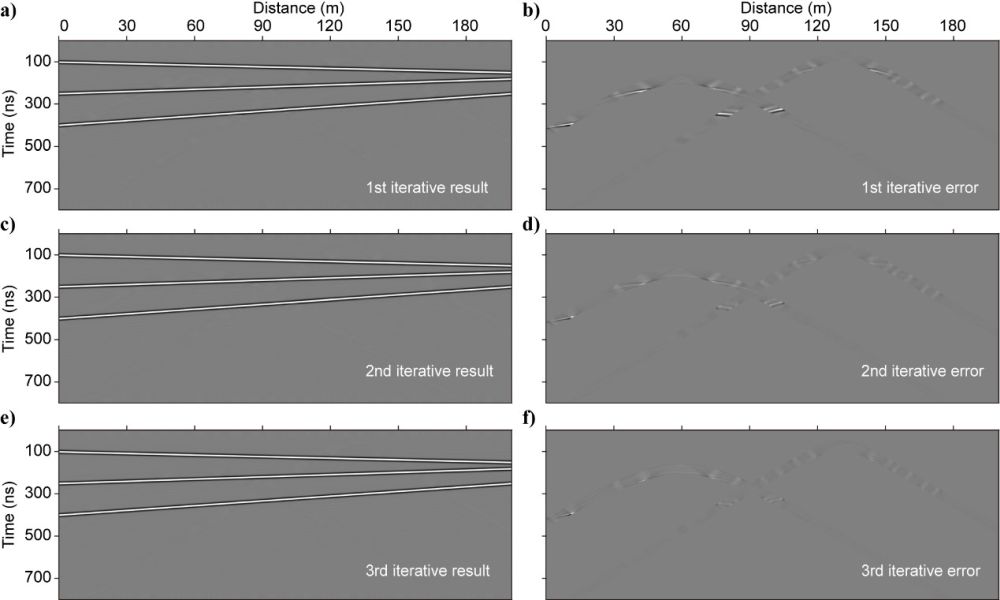 中科院地質與地球物理所地球與行星物理院重點實驗室的博士生李超與導師張金海研究員等合作,開發(fā)了一種基于迭代Stolt偏移/反偏移的地表繞射波分離方法。他們首先利用真空中的光速開展Stolt聚焦偏移以識別繞射波,并對識別出的偏移域繞射波頂點進行反偏移,從而生成未偏移域的窗函數(shù),并對輸入的探地雷達數(shù)據(jù)進行分割,形成以該繞射波為主體的數(shù)據(jù)體(圖2c),剩余的數(shù)據(jù)體(圖2b)則以地下反射波和繞射波為主。利用真空中的光速對窗內的數(shù)據(jù)進行Stolt偏移,從而使地表繞射波聚焦在偏移域中的局部區(qū)域而免受窗外信號對其形成干擾(圖2d)。相比之下,原本被地表繞射波所掩蓋的有效信號(即窗口內的有效信號)經過偏移后會被拉伸,從而與聚焦的地表繞射波進一步分離,只有極小部分仍被覆蓋(圖2d)。此時,在偏移域利用新的窗函數(shù)再一次分離地表繞射波和有效信號,并且分別對二者進行反偏移,就能得到第一次迭代恢復的有效信號(圖2h)和地表繞射波(圖2g)。最后,分離出的地表繞射波中仍殘存一些微弱的地下有效信號(圖2g),將其作為下一輪迭代的輸入數(shù)據(jù),但采用亞光速和超光速進行完全一致的二次乃至三次分離,就可以進一步分選出更多殘存的地下有效信號(圖3)。