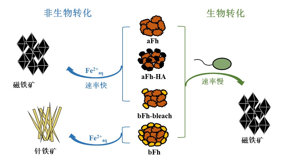 圖2 非生物及微生物還原條件下四種水合氧化鐵二次礦化過程示意圖。其中四種水合氧化鐵(Fh)包括:化學(xué)成因的水合氧化鐵(aFh);與腐殖酸共沉淀的化學(xué)成因的水合氧化鐵(aFh-HA);由厭氧光合鐵氧化菌R. ferrooxidans SW2礦化形成的生物成因水合氧化鐵(bFh),以及用漂白劑處理去除生物有機(jī)物的生物成因水合氧化鐵(bFh-bleach)
