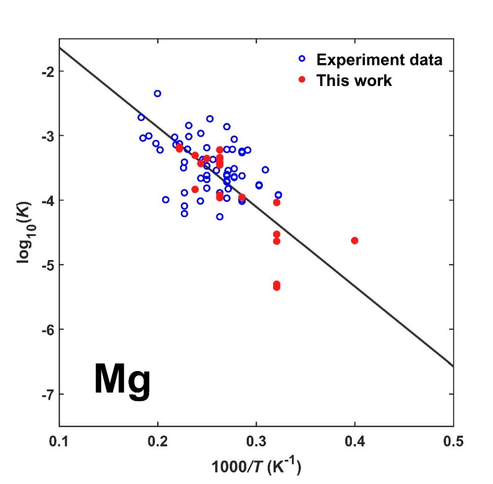 Mg和O。藍(lán)色圓環(huán)代表過去的高溫高壓實(shí)驗(yàn)數(shù)據(jù),紅色圓點(diǎn)是本次實(shí)驗(yàn)得到的數(shù)據(jù)。黑線是回歸得到的鎂的平衡常數(shù)與溫度的關(guān)系。高溫下,硅酸鹽中的MgO趨向生成Mg和O進(jìn)入液態(tài)鐵中